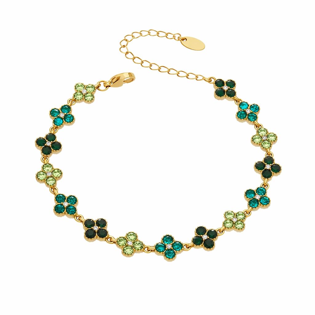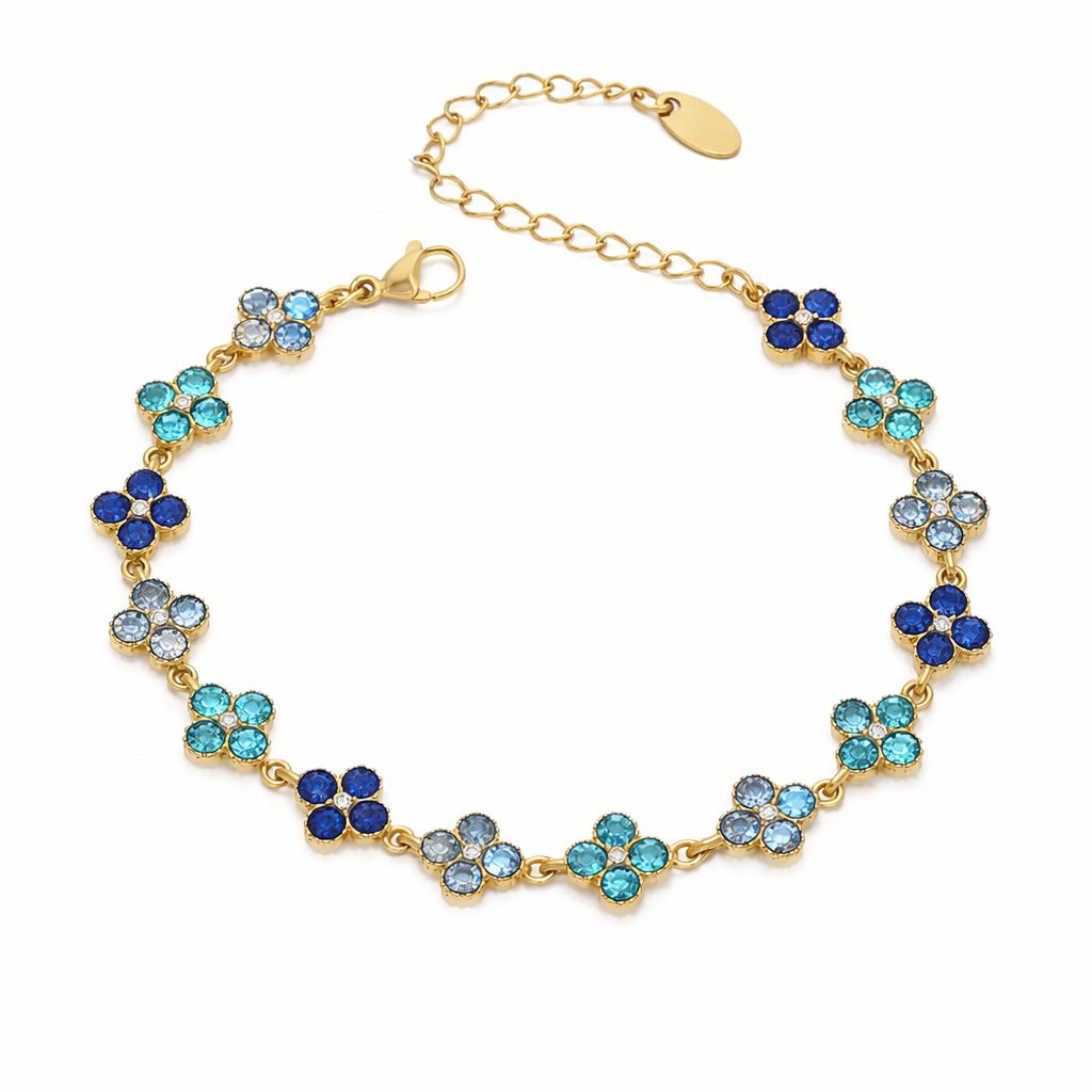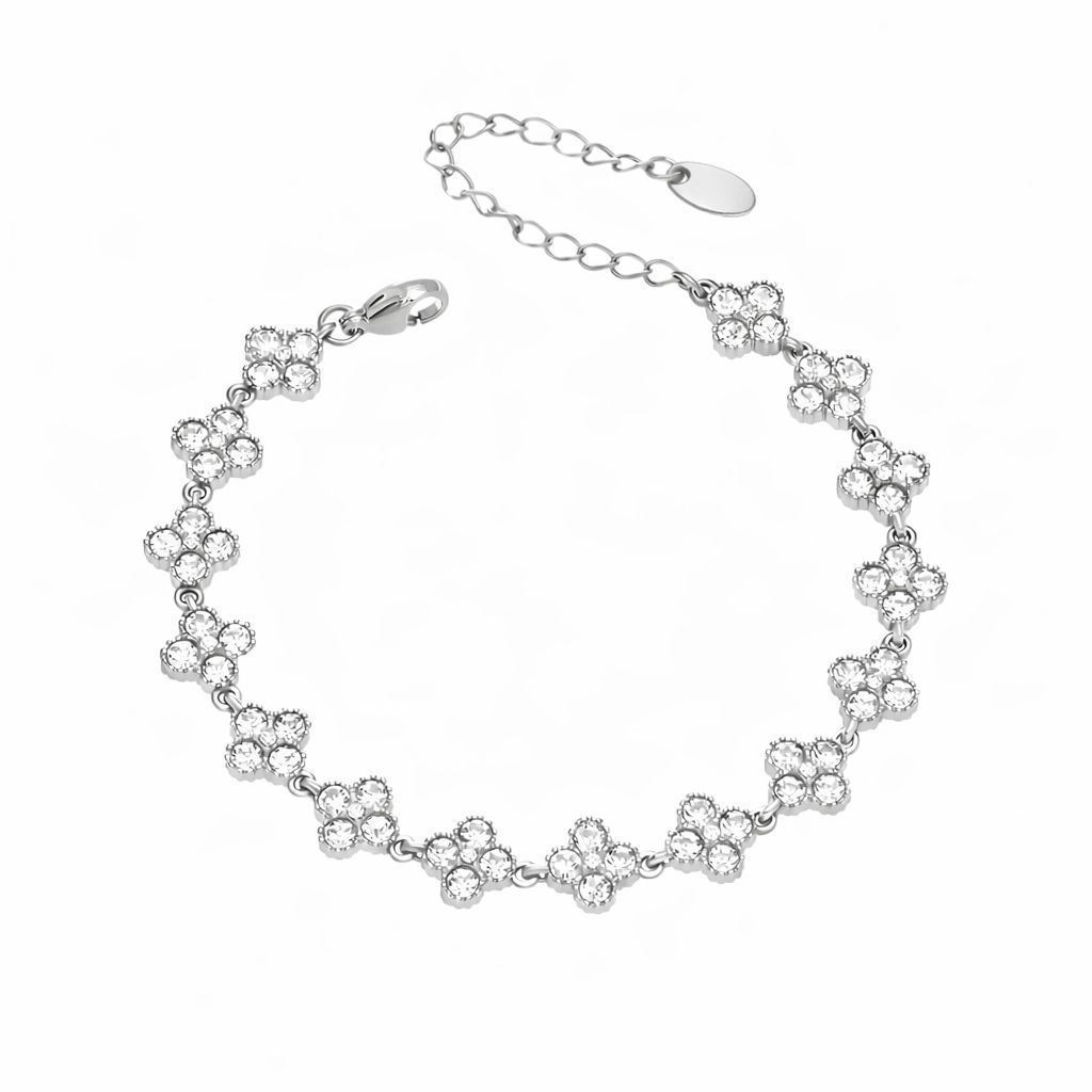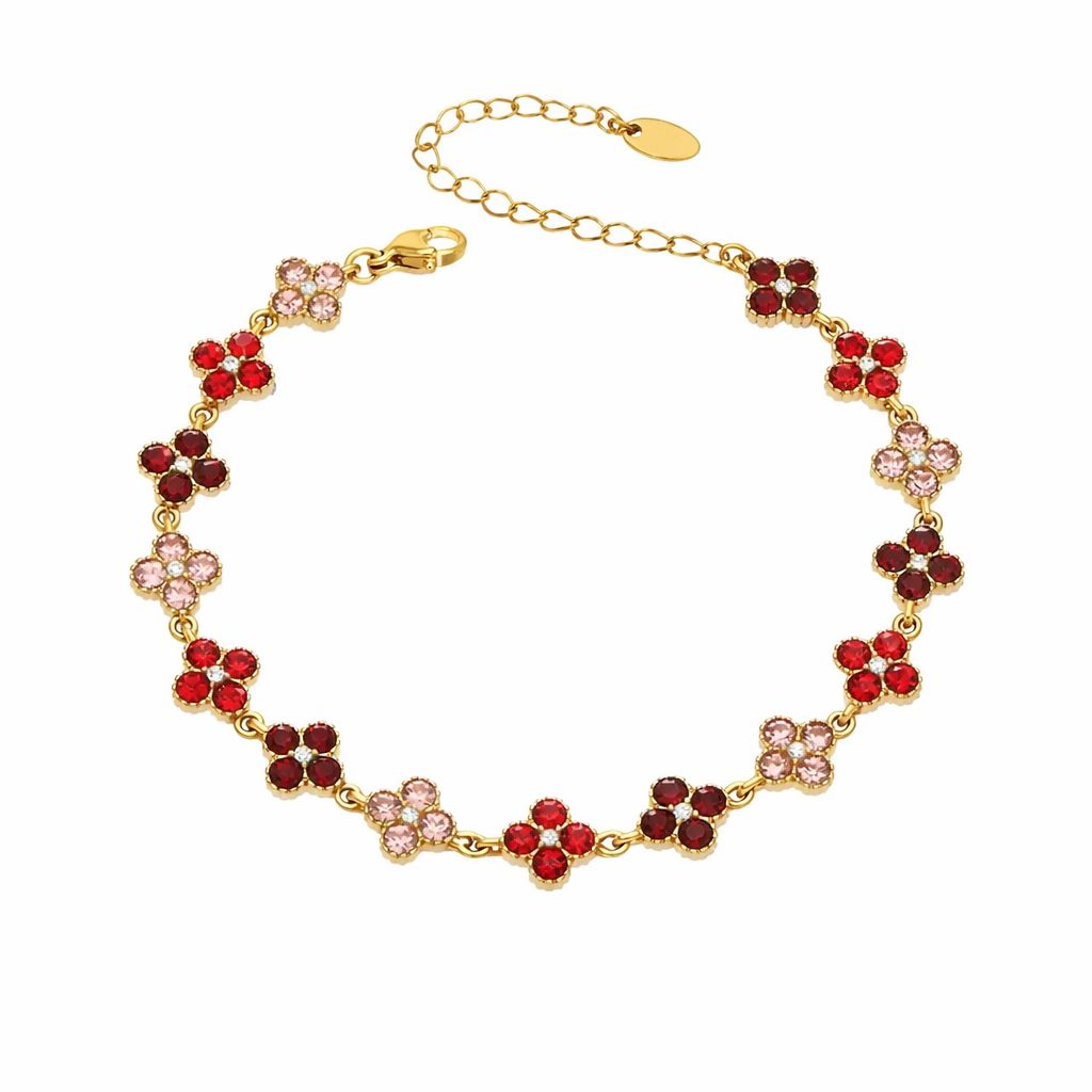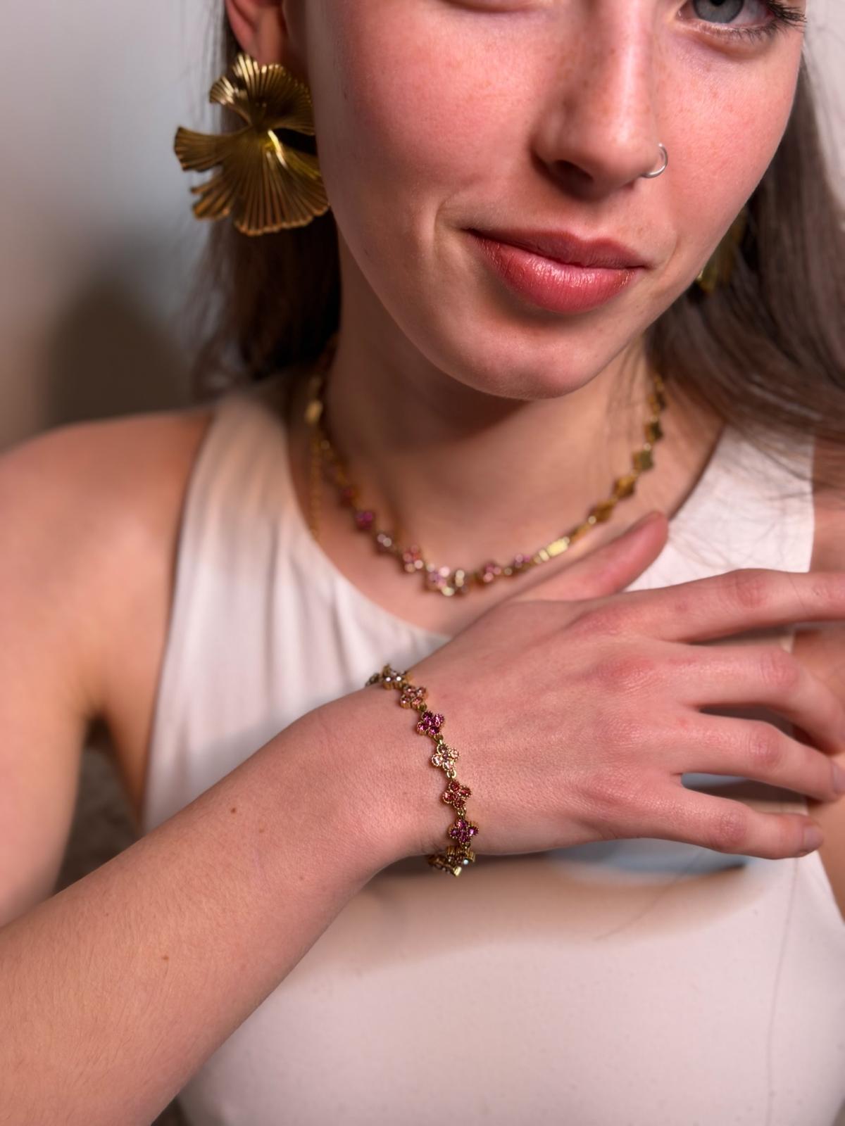 Il Bracciale Flora è realizzato in acciaio inox con finitura di alta qualità ed è decorato da una sequenza di fiori luminosi impreziositi da zirconi, disponibili in diverse tonalità colore.