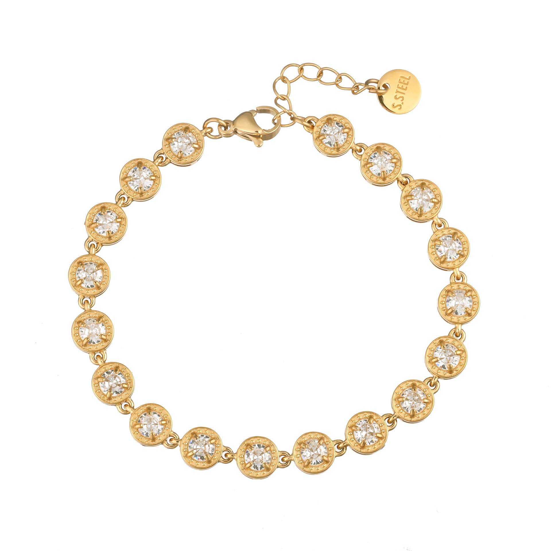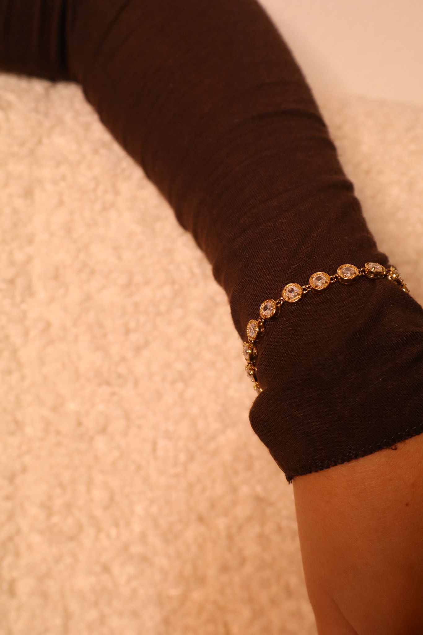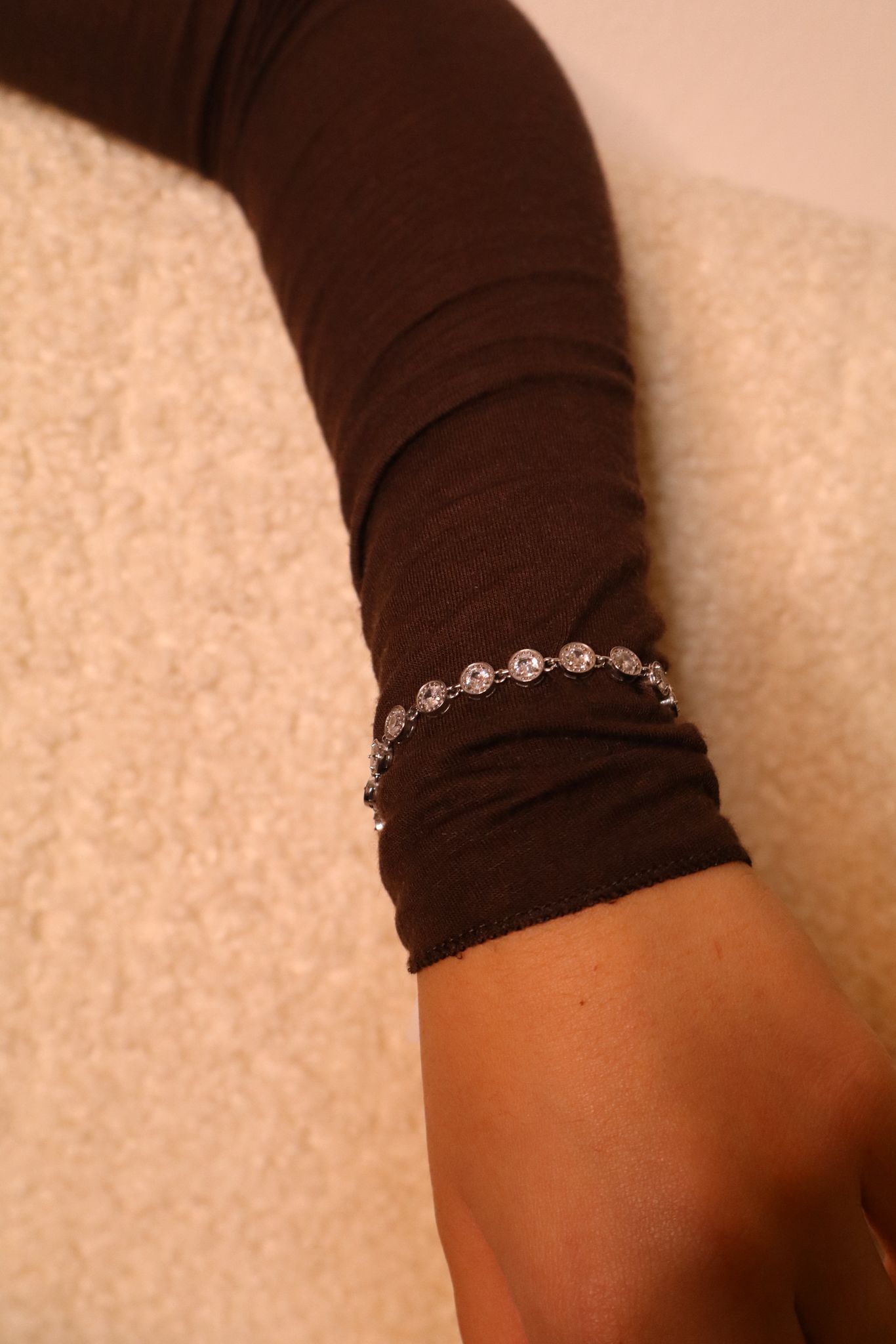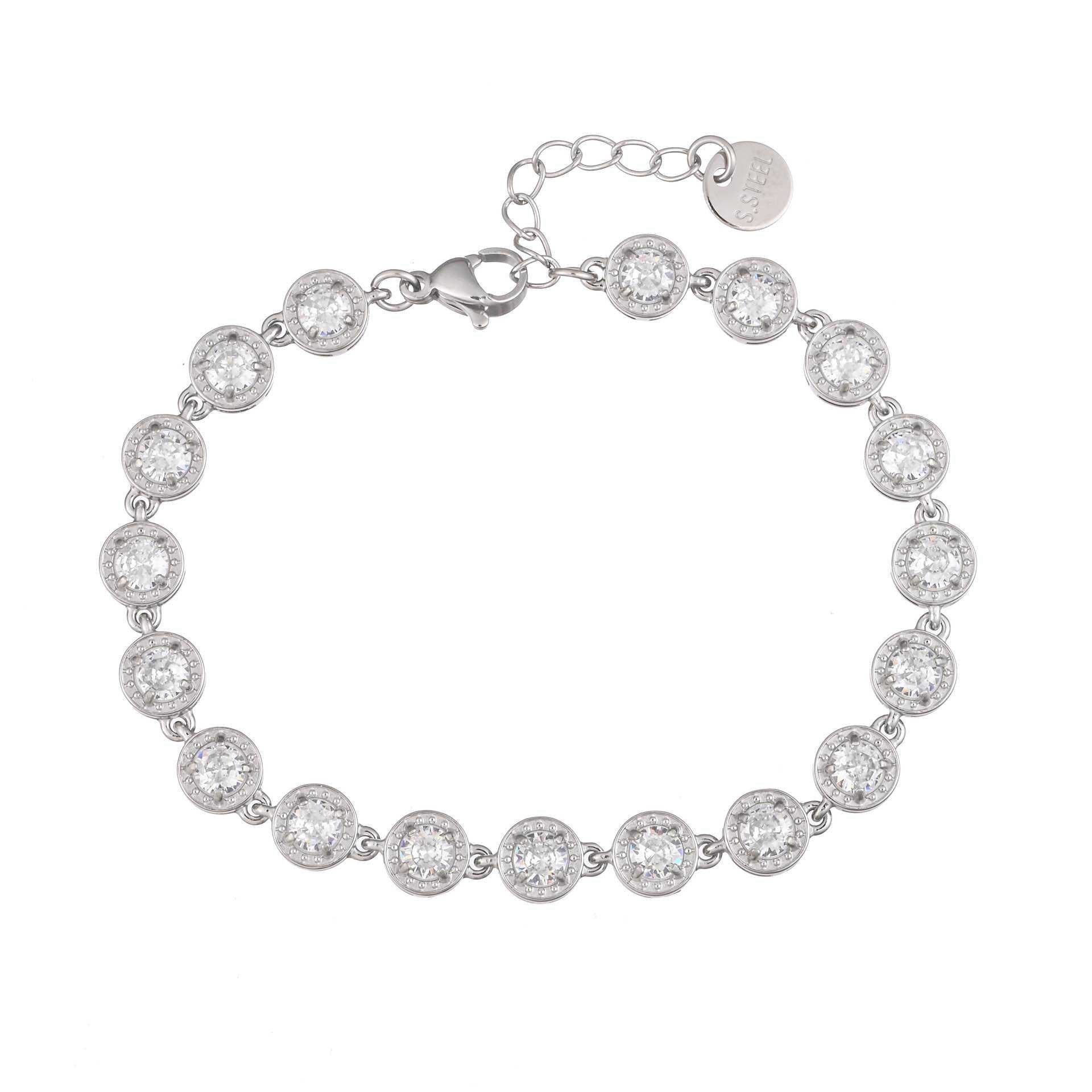 Le pietre sono rotonde e disposte in modo uniforme lungo tutto il bracciale, creando un effetto luminoso raffinato ma sempre discreto.